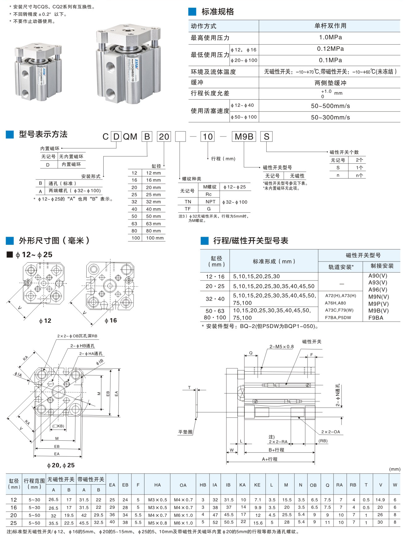 薄型氣缸 - 薄型氣缸/帶導桿CQM系列